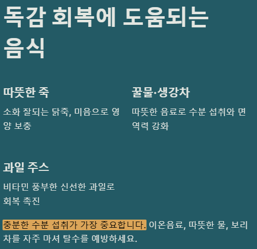 독감에 걸리면 충분한 수분 섭취가 매우 중요해요. 따뜻한 물, 보리차, 이온 음료 등을 자주 마셔 탈수를 예방해야 합니다. 또한, 소화가 잘되고 영양가 높은 유동식이나 부드러운 음식을 섭취하는 것이 좋아요. 죽, 미음, 닭죽, 과일 주스 등이 도움이 될 수 있습니다. 저는 개인적으로 따뜻한 꿀물이나 생강차도 좋더라고요.