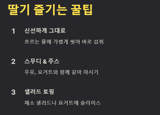 💡 팁: 딸기 8개만 먹어도 하루 권장 비타민 C 섭취량을 채울 수 있다고 해요! 정말 놀랍지 않나요?