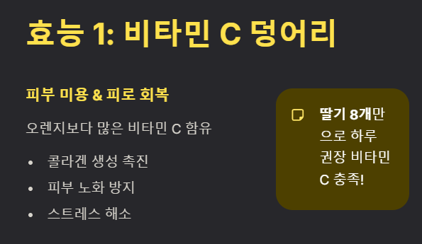 💡 팁: 딸기 8개만 먹어도 하루 권장 비타민 C 섭취량을 채울 수 있다고 해요! 정말 놀랍지 않나요?