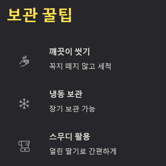 딸기는 정말 활용도가 높은 과일이에요. 저만의 비밀 팁 하나를 드리자면, 딸기를 씻어서 얼려두면 오랫동안 신선하게 보관할 수 있고, 얼린 딸기는 스무디 만들 때 정말 유용하답니다!