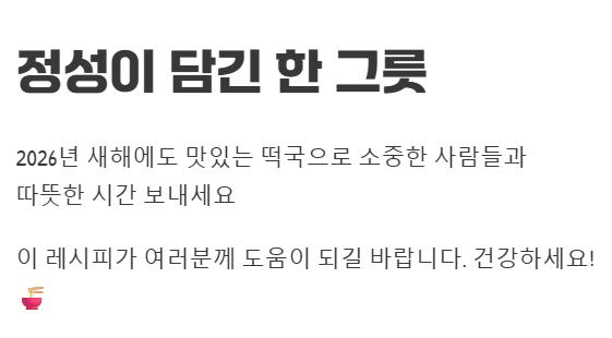 2026년 새해에도, 그리고 평소에도 맛있는 떡국 한 그릇으로 소중한 사람들과 따뜻한 시간을 보내시길 바랍니다.