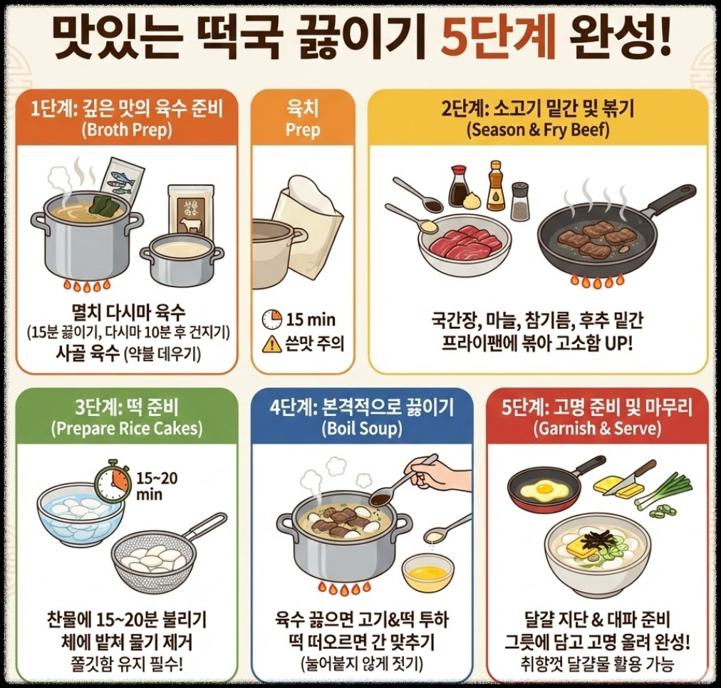 그런데 막상 집에서 끓이려고 하면 "어? 육수는 뭘로 내지?", "떡은 얼마나 불려야 하지?", "고명은 뭘 준비해야 맛있을까?" 같은 고민에 빠지게 됩니다.