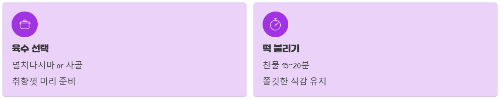 떡은 끓이기 전에 찬물에 충분히 불려주는 것이 포인트인데, 너무 오래 불리면 퍼질 수 있으니 주의해야 해요.