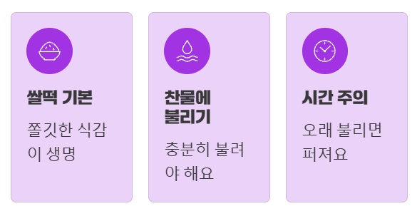 떡의 두께나 건조 상태에 따라 약간의 차이가 있을 수 있지만, 너무 오래 불리면 떡이 퍼져서 쫄깃한 식감을 잃을 수 있으니 주의하세요.