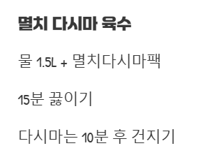 | 육수 (멸치 다시마 또는 사골) | 1.5L | 취향껏 선택 |