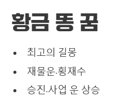 | 황금 똥 꿈 | 엄청난 재물운, 횡재수 | 대길몽 |