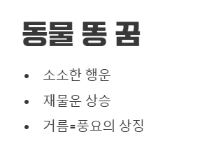 | 동물 똥을 보거나 밟는 꿈 | 소소한 행운, 재물 상승 | 길몽 |