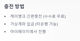 - 케이뱅크 계좌가 없는 경우: 마이페이지 → [충전하기] → [가상계좌 입금] 선택. 회원가입 시 발급된 케이뱅크 가상계좌로 충전 금액을 선택 후 이체하면 되는데, 다른 은행 계좌에서도 입금할 수 있습니다.