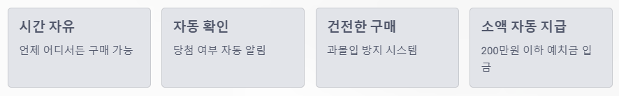 | 200만원 이하 (3~5등) | 추첨일 다음 날(일요일 06시경) 예치금 계정으로 자동 지급 (비과세) |