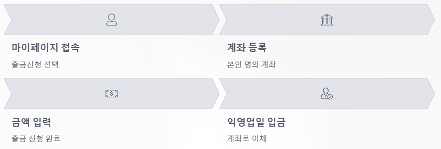 마이페이지에서 [출금신청]을 선택하고, 본인 명의 계좌를 등록한 후 출금 금액을 입력하면 돼요.