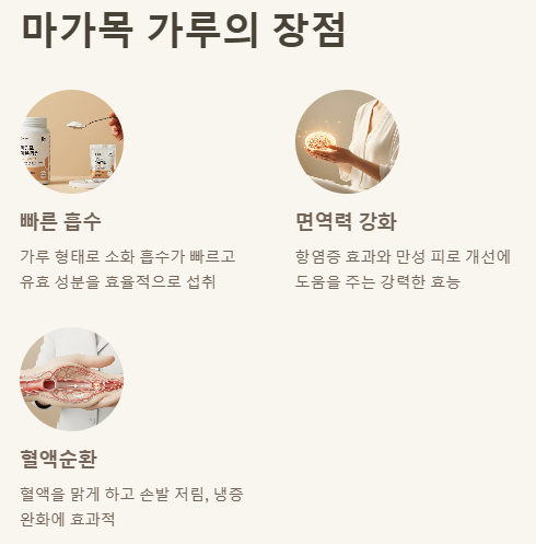 2. 간편한 영양 섭취: 마가목 가루는 소화 흡수율이 높고, 면역력 및 혈액순환 개선에 좋습니다.