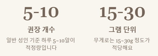 2. 하루 5~10알 (15~30g)이 일반적인 권장 섭취량이며, 개인에 따라 조절해야 합니다.