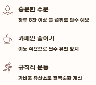 - ✅ 카페인과 알코올 줄이기: 이들은 이뇨 작용을 촉진하여 탈수를 유발하거나, 뇌 기능을 저하시켜 어지럼증을 악화시킬 수 있어요.