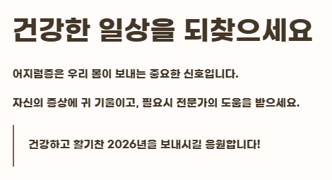 - 충분한 수분, 영양 균형, 수면, 스트레스 관리는 어지럼증 완화에 큰 도움이 됩니다.