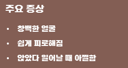 | 빈혈 | 앉았다 일어날 때 아찔함, 피로, 창백함 | 적혈구/헤모글로빈 부족, 철분 결핍 |