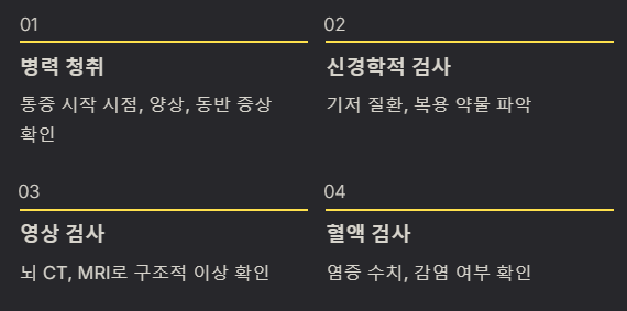 - 병력 청취 및 신경학적 검사: 언제부터 아팠는지, 통증의 양상, 동반 증상 등을 자세히 물어보세요. 이때 평소 복용하는 약이나 기저 질환에 대해서도 솔직하게 이야기하는 것이 중요해요.