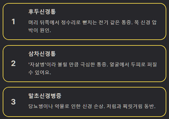 - 후두신경통 (Occipital Neuralgia): 머리 뒤쪽에서 시작해 정수리나 귀 뒤쪽으로 뻗치는 통증이에요. 목 뒤쪽의 후두 신경이 압박되거나 손상되면서 발생하는데, 찌릿하거나 전기 오는 듯한 느낌이 특징이죠. 저도 한때 목 디스크 때문에 이런 통증을 겪었던 적이 있어서 남 일 같지 않아요.