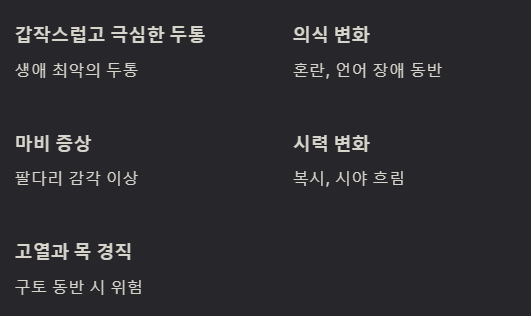 - 갑작스럽고 극심한 두통 (생애 최악의 두통)