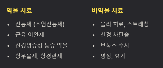 | 비약물 치료 | 물리 치료 (목 스트레칭, 자세 교정), 신경 차단술, 보톡스 주사 (만성 편두통), 스트레스 관리 (명상, 요가), 인지 행동 치료 등. |