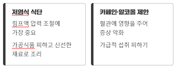 저염식 위주의 식단과 충분한 수분 섭취가 권장됩니다.