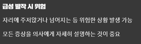 특히 '급성 발작' 시에는 자리에 주저앉거나 넘어지는 등의 위험한 상황이 발생할 수도 있습니다.