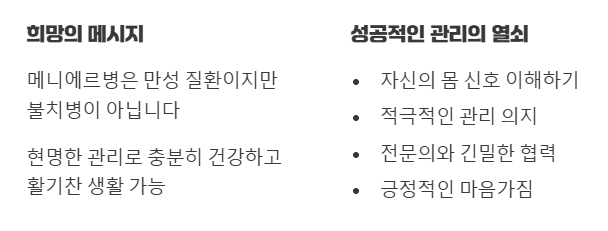 💡 팁: 메니에르병은 만성 질환으로 분류되지만, 적절한 관리와 치료를 통해 증상 발생 빈도와 강도를 줄일 수 있습니다.