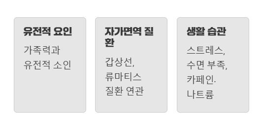 유전적 소인을 가진 분들도 있고, 갑상선 질환이나 류마티스 질환 같은 자가면역 질환과도 연관성이 있다는 연구 결과도 있습니다.