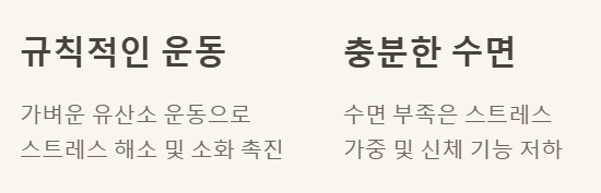 - 규칙적인 운동: 가벼운 유산소 운동은 스트레스 해소 및 소화기 운동에 긍정적입니다.