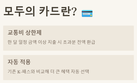 '모두의 카드'는 쉽게 말해 대중교통비의 상한선을 정해두는 제도입니다. 한 달 동안 대중교통비로 일정 금액 이상을 지출하면, 그 초과분을 전액 돌려받는 방식이에요.