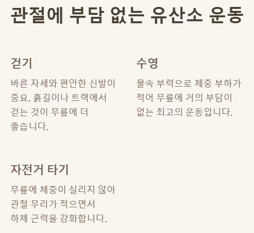 - 수영: 물속에서는 부력 때문에 체중 부하가 적어 무릎 관절에 거의 부담이 없어요. 전신 근육을 사용하며 심폐 기능을 효과적으로 단련할 수 있는 최고의 운동이라고 생각합니다.