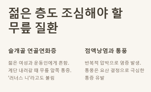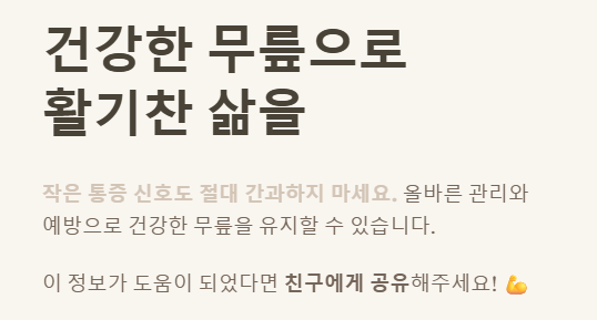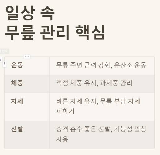 - 4. 예방과 관리가 핵심이에요: 꾸준한 운동(근력 강화), 적정 체중 유지, 바른 자세, 편안한 신발 착용으로 무릎 건강을 지킬 수 있어요.