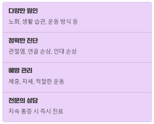 - 퇴행성 관절염, 연골 손상, 인대 손상 등 의학적 원인 진단이 중요해요.
