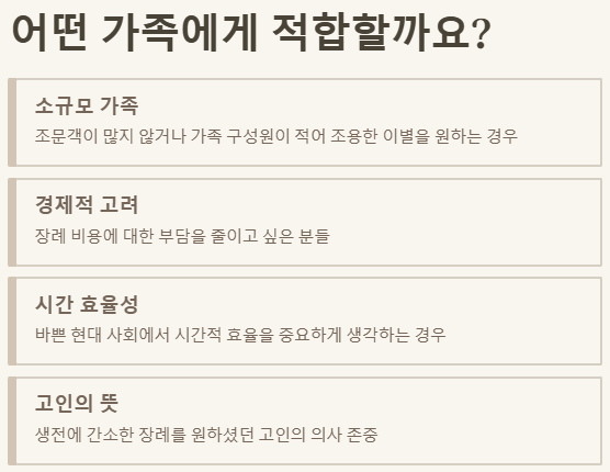 - 소규모 가족, 경제적 부담, 고인의 뜻을 존중할 때 현명한 선택지가 될 수 있습니다.