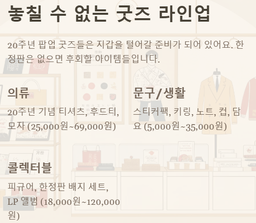 - 2. 굿즈는 20주년 한정판 & LP 앨범 강추! 후회 없는 소장을 위해 미리 찜해두세요.