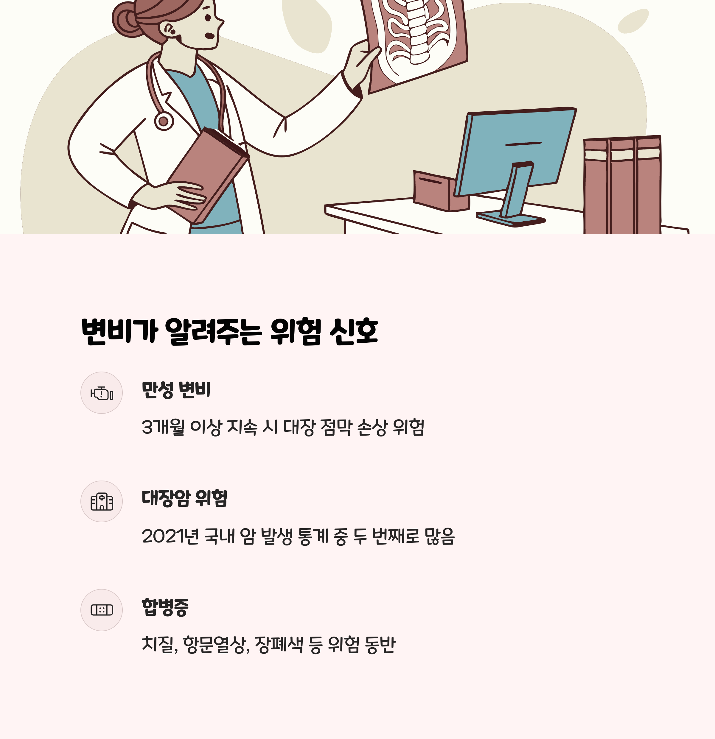 또한 만성 변비는 치질, 항문열상, 장폐색 등 합병증 위험도 동반됩니다.