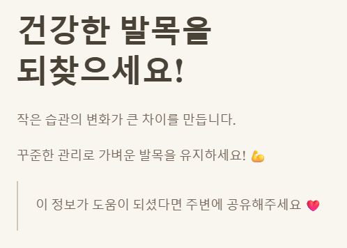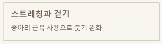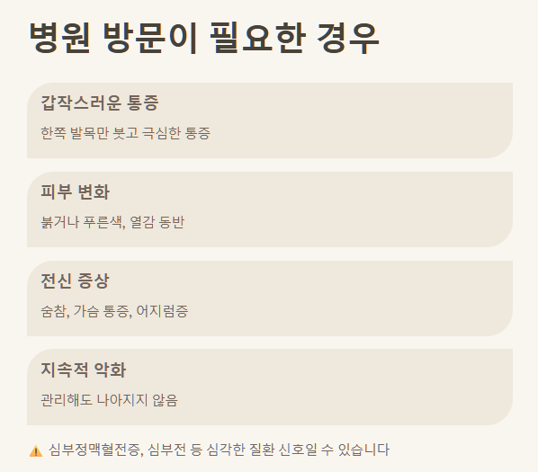 - ✅ 생활 속 관리 중요: 충분한 휴식, 다리 올리기, 스트레칭, 압박 스타킹, 저염식, 족욕 및 마사지