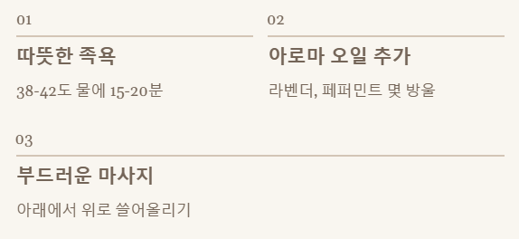 A3. 족욕 시 따뜻한 물에 아로마 오일(라벤더, 페퍼민트 등) 몇 방울을 떨어뜨리거나, 천일염 또는 에센셜 솔트를 한 스푼 넣어주면 혈액순환 촉진과 피로 해소에 더욱 좋습니다. 단, 피부 질환이 있거나 상처가 있는 경우에는 자극이 될 수 있으니 주의해야 해요. 족욕은 15~20분 정도가 적당하며, 물 온도는 너무 뜨겁지 않은 38~42도 정도가 좋습니다.