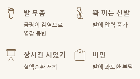 - ✅ 무좀, 잘못된 신발, 비만, 과음 등 생활 습관 관련 원인도 무시할 수 없어요.