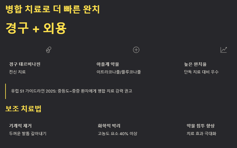 최근 유럽 S1 가이드라인(2025년 업데이트판)에서는 중등도~중증 발톱무좀의 경우 "경구 + 외용 병합 치료"를 강력히 권고하고 있습니다. 예비 연구에서는 테르비나핀에 아졸계 약물(이트라코나졸, 플루코나졸)을 병합하면 테르비나핀 단독보다 더 높은 완치율을 보였다고 해요. 정말 희망적인 소식이죠!