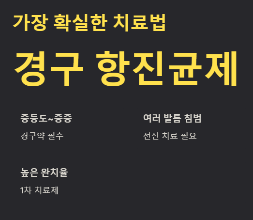 2. 경구 테르비나핀이 1차 치료제: 중등도 이상이라면 12주간의 경구 테르비나핀 복용이 가장 효과적이며, 높은 완치율을 보입니다.