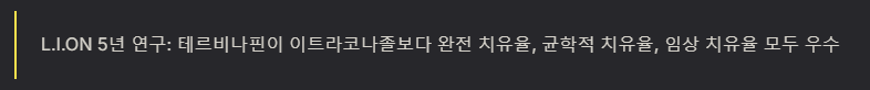 특히 흥미로운 것은, 5년간 추적한 L.I.ON 연구 결과인데요, 테르비나핀을 꾸준히 복용한 그룹이 이트라코나졸 간헐 요법 그룹보다 완전 치유율, 균학적 치유율, 임상 치유율 모두에서 훨씬 우수했습니다. 이 결과만 봐도 테르비나핀의 위력을 알 수 있습니다.
