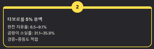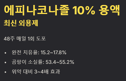 이 외용제 역시 48주 1일 1회 도포 시 완전 치유율 6.5~9.1%, 곰팡이 소실률 31.1~35.9%를 보였습니다. 경증~중등도 환자에게 좋은 선택지가 될 수 있습니다.