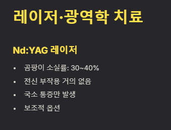 Nd:YAG 레이저 같은 레이저 치료도 보조적인 옵션으로 많이 사용됩니다. 연구에 따라 곰팡이 소실률이 30~40% 수준으로 보고되지만, 아직은 표본 수가 적고 프로토콜이 다양해서 현재 가이드라인에서는 '보조적 옵션' 정도로 평가되고 있어요. 그래도 국소 통증 외 전신 부작용이 거의 없다는 점은 분명한 장점이죠. 다만, 한 번 시술 비용이 비싸고 4~8회 이상 반복 시술이 필요한 경우가 많다는 점은 고려해야 합니다.