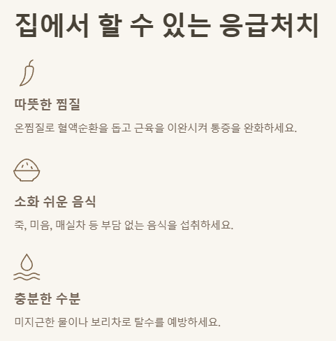 병원에 가야 할 심각한 상황이 아니라면, 집에서 통증을 완화하고 예방할 수 있는 방법들을 시도해볼 수 있습니다. 제가 개인적으로 효과를 봤던 방법들도 있으니 참고해보세요.