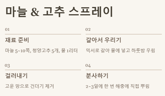 - 만드는 법: 마늘과 고추를 잘게 다지거나 믹서에 갈아주세요. 갈아낸 재료를 물 1리터에 넣고 하룻밤 정도 우려냅니다. 다음 날 고운 망으로 건더기를 걸러내면 완성!