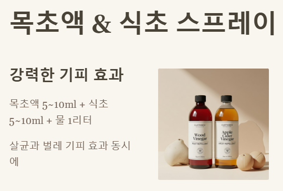 목초액은 살균 효과와 함께 벌레 기피 효과가 뛰어나요. 식초도 마찬가지로 산성을 띠어 해충이 싫어하는 환경을 만들죠. 생각해보니 이걸 같이 쓰면 시너지가 정말 좋아요!