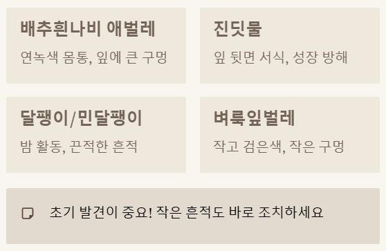 | 벼룩잎벌레 | 작고 검은색, 잘 튀어 오름 | 잎에 작은 구멍을 많이 만듦 (총채벌레 피해와 비슷) |