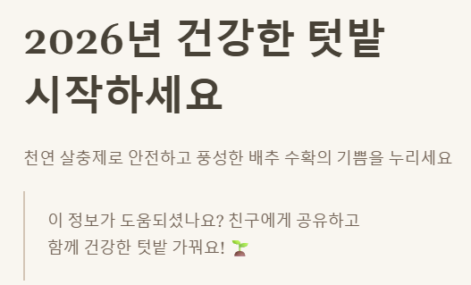 - 지속 가능성: 건강한 텃밭 생태계를 조성하여 장기적으로 해충 문제를 스스로 해결할 수 있는 기반을 마련합니다.