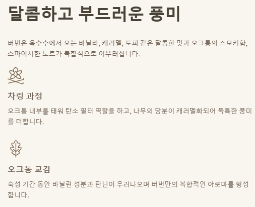 - ✅ 옥수수와 오크통 숙성 덕분에 바닐라, 캐러멜 같은 달콤하고 부드러운 맛과 향이 특징입니다.