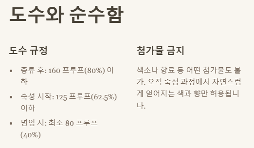 • 첨가물: 색소나 향료 등 어떤 첨가물도 넣어서는 안 됩니다. 오직 숙성 과정에서 자연스럽게 얻어지는 색과 향만을 허용해요.
